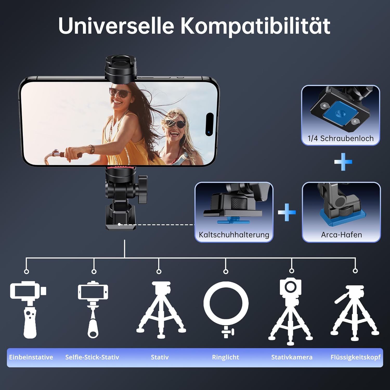 • 【Flexibler Winkel】Handy-Stativhalterung mit 360°-Drehung und 145°-Neigungswinkel. Durch die 360°-Drehung können Sie problemlos zwischen Hoch- und Querformat wechseln, und der Neigungswinkel von 145° ermöglicht einfache Aufnahmen über Kopf.